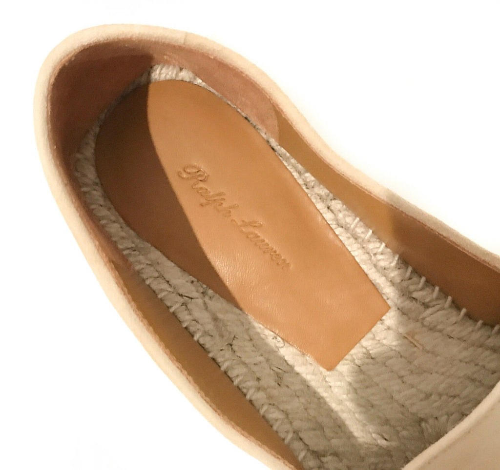 New RALPH LAUREN Geyla Suede Espadrille, Size 8.5/8.5 US Brand: Ralph Lauren Style: Geyla Condition: New in box Color: Biscuit Material: Suede upper/Jute and Rubber sole Size: 38.5 / 8.5 US UPC: 191232091185 Slip on style Made in Spain Dust bag included